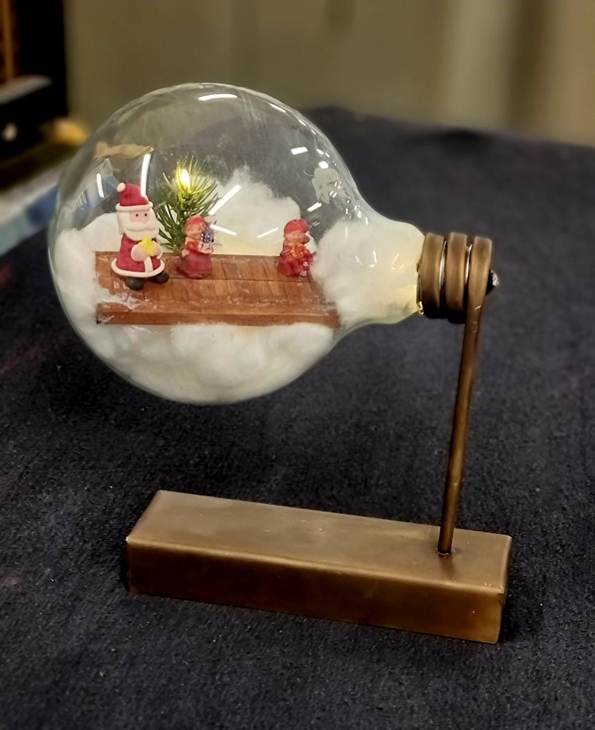 Dette er en stor pære som jeg har bygget sne landskab inde i med lille juletræ og nissemand og damer. Bunden er bygget i messing og holder baterrig til selve den lille led der er i toppen af juletræet samt lys i sneen.